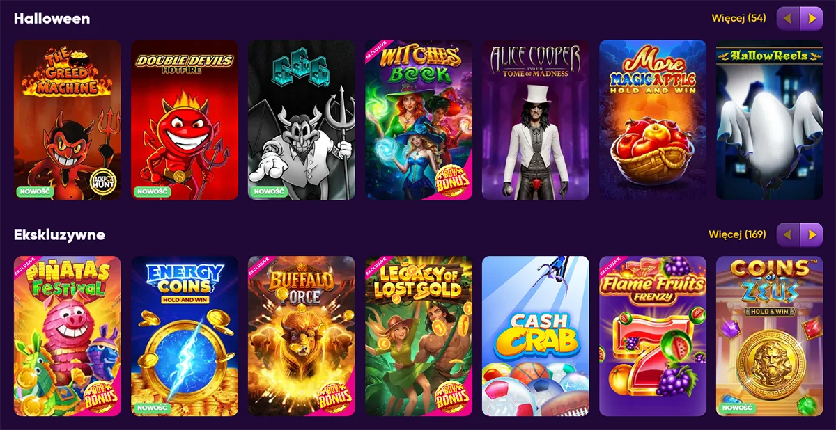 Oferujemy szeroki wybór gier od najlepszych dostawców w branży. Nasze portfolio obejmuje tysiące automatów do gier, profesjonalne gry na żywo oraz ekskluzywne tytuły z możliwością wygrania ogromnych jackpotów progresywnych.