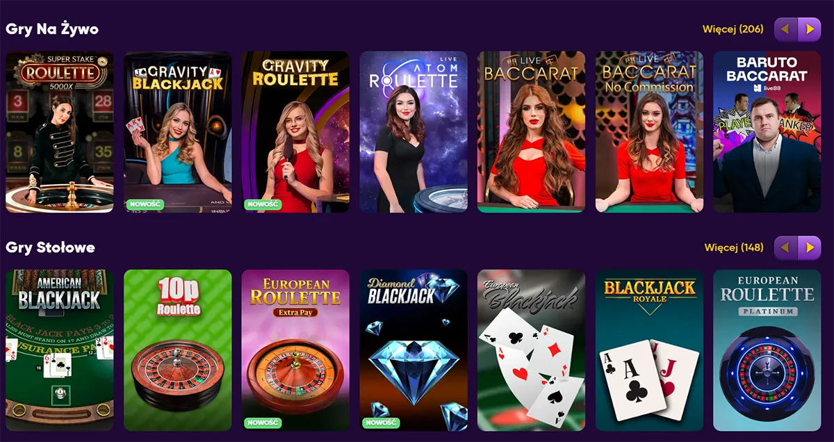 - Gry stołowe - klasyczne gry karciane i ruletka